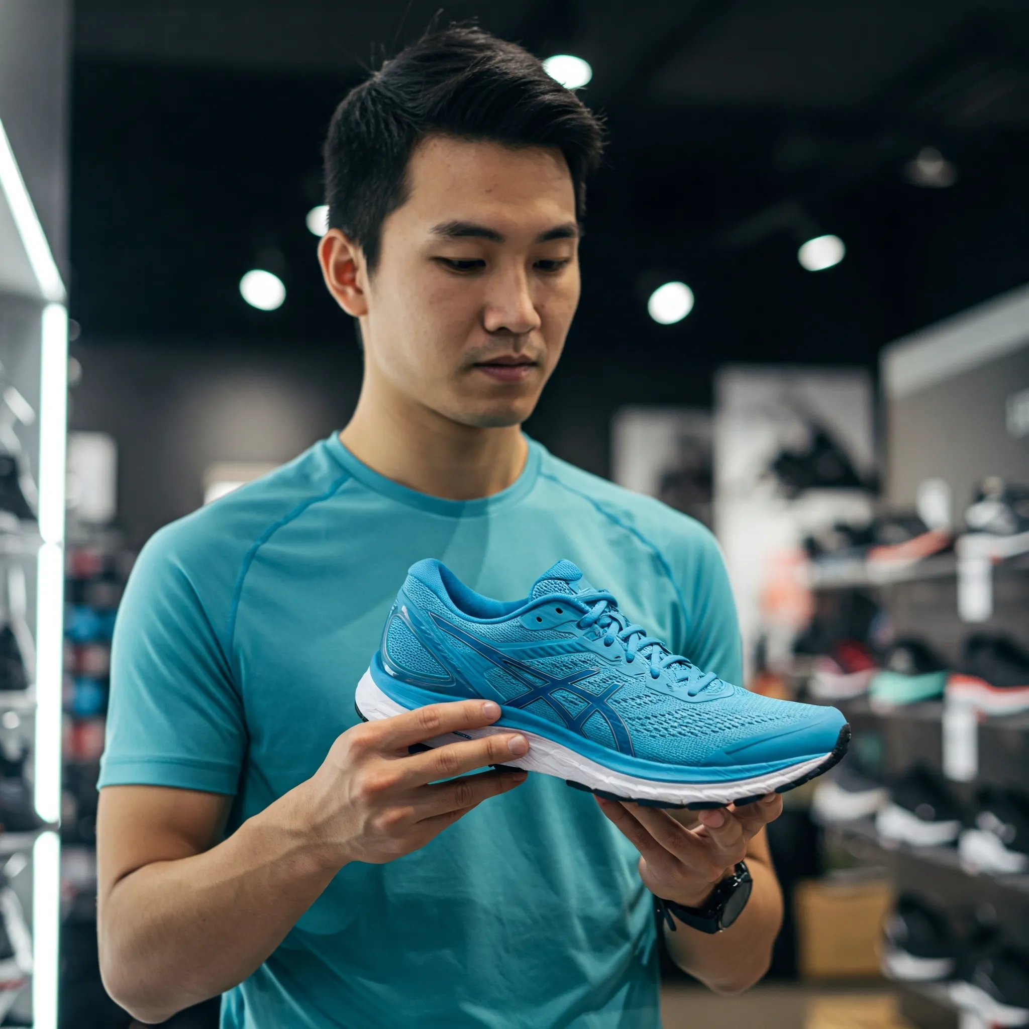 ผู้ชายกำลังพิจารณารองเท้าวิ่งสีฟ้าในร้านขายอุปกรณ์กีฬา การเลือกรองเท้าที่ถูกต้องเป็นสิ่งสำคัญสำหรับการวิ่งที่ปลอดภัย  - เตรียมเสื้อผ้าที่ระบายอากาศได้ดี:** เลือกเสื้อผ้าที่ใส่สบาย ระบายอากาศได้ดี และไม่รัดแน่นจนเกินไป เพื่อให้คุณรู้สึกคล่องตัวขณะวิ่ง