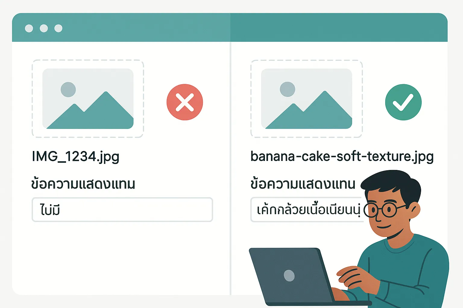 IMG_1234.jpg! - ควร: ตั้งชื่อเป็นภาษาอังกฤษ (ปลอดภัยสุด) หรือไทยก็ได้ ใช้ “คำที่สื่อถึงสิ่งที่อยู่ในรูป” และ “ใส่ Keyword ที่เกี่ยวข้อง” (ถ้าเหมาะสม)